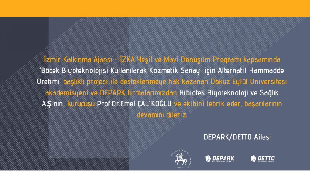 İzmir Kalkınma Ajansı – İZKA Yeşil ve Mavi Dönüşüm Programı kapsamında ‘Böcek Biyoteknolojisi Kullanılarak Kozmetik Sanayi için Alternatif Hammadde Üretimi’ başlıklı projesi ile desteklenmeye hak kazanan Dokuz Eylül Üniversitesi akademisyeni ve DEPARK firmalarımızdan Hibiotek Biyoteknoloji ve Sağlık A.Ş.’nın kurucusu Prof. Dr. Emel ÇALIKOĞLU ve ekibini tebrik eder, başarılarının devamını dileriz.