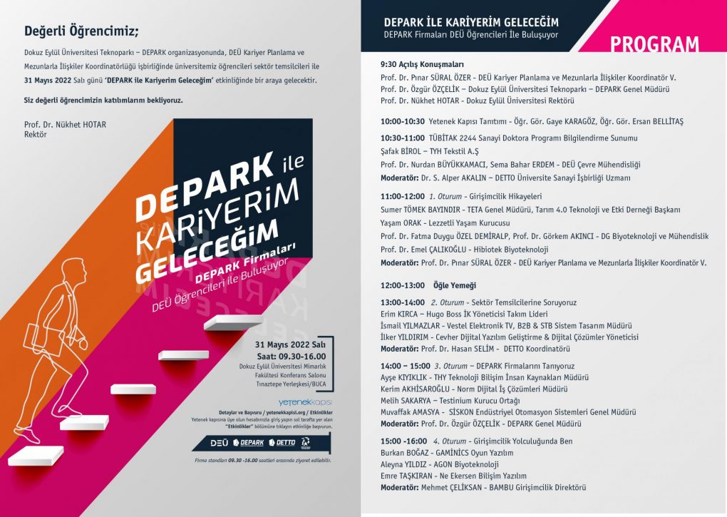 Dokuz Eylül Üniversitesi Teknoparkı – DEPARK organizasyonunda, DEÜ Kariyer Planlama ve Mezunlarla İlişkiler Koordinatörlüğü işbirliğinde üniversitemiz öğrencileri sektör temsilcileri ile 31 Mayıs 2022 Salı günü ‘DEPARK ile Kariyerim Geleceğim’ etkinliğinde bir araya gelecektir.